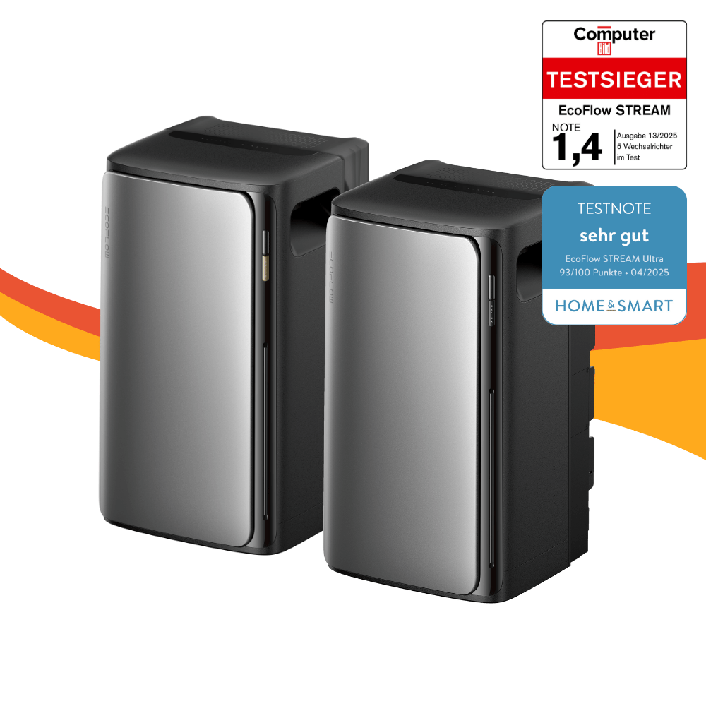 Volle Power im Doppelpack mit dem Speicher EcoFlow STREAM Ultra und der Erweiterungsbatterie STREAM AC Pro (je 1,92 kWh). Einzigartig: Beide zusammen liefern 2300 W AC-Output und versorgen auch große Verbraucher wie Waschmaschinen.